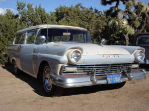 The U.S. built Ford Courier from 1952 to 1958 was marketed as a "sedan delivery" designated body code 78A, and was based on the contemporary sedan and station wagon designs. During the 1957 and 1958 model year, a windowed variant of the Courier was marketed for fleet orders and a number were produced primarily for government services such as the U.S. Forest Service and Post Office. While from the outside these models looked like the series "59" tudor Ranch wagon, they retained their model code 78A. From 1952 to 1956 access to the rear storage area was through a unique door hinged on the side. For 1957 and 1958, the rear access door was a combination of the lift gate and tailgate being connected with two connecting struts. This design meant that the rear door backglass had to be divided into three sections, two outer curved portions and a center piece. In 1959 all Couriers took on the windowed body style very similar to the tudor Ranch Wagons and their model code was re-designated as 59E. The last year for the passenger car based Courier would be 1960 where it would remain a commercial wagon. During this same period in Canada, this passenger car based van was marketed simply as the Sedan Delivery in both the Ford and Meteor lines from 1952 to 1958. For 1959 and 1960, they were sold as commercial wagons with the Meteor continuing the model up to the 1961 model year. (from wikipedia) |
